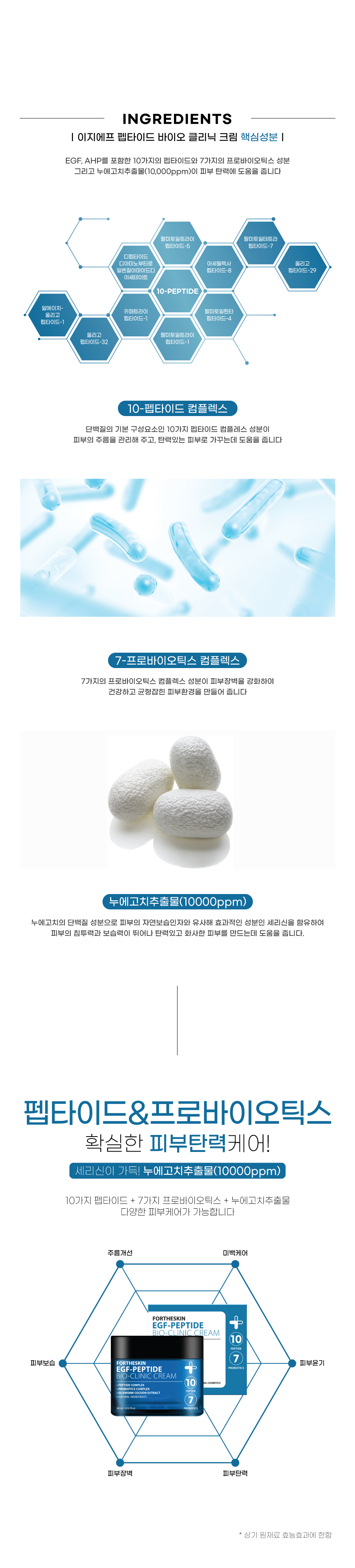 10-펩타이드 복합체와 7-프로바이오틱스 성분이 피부 탄력과 볼륨감을 높여 미백과 주름 개선에 도움을 줍니다. 또한 자연에서 발견되는 18가지 유효성분이 피부에 생기를 부여하여 피부를 건강하고 아름답게 가꿔줍니다.