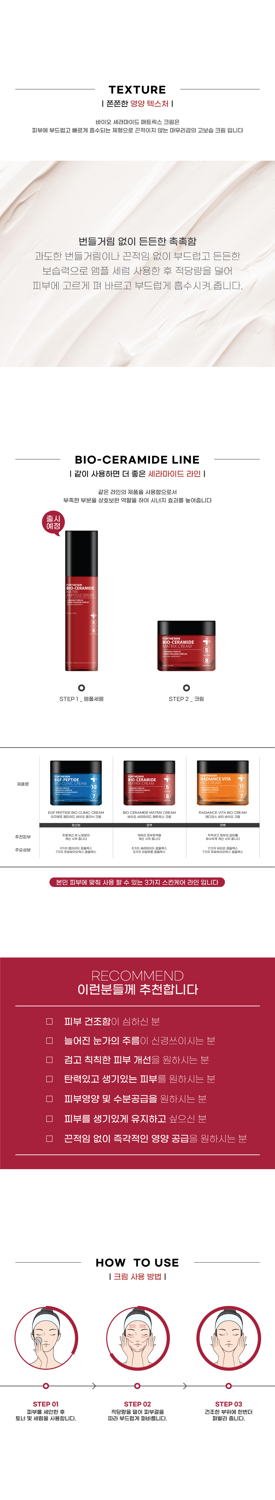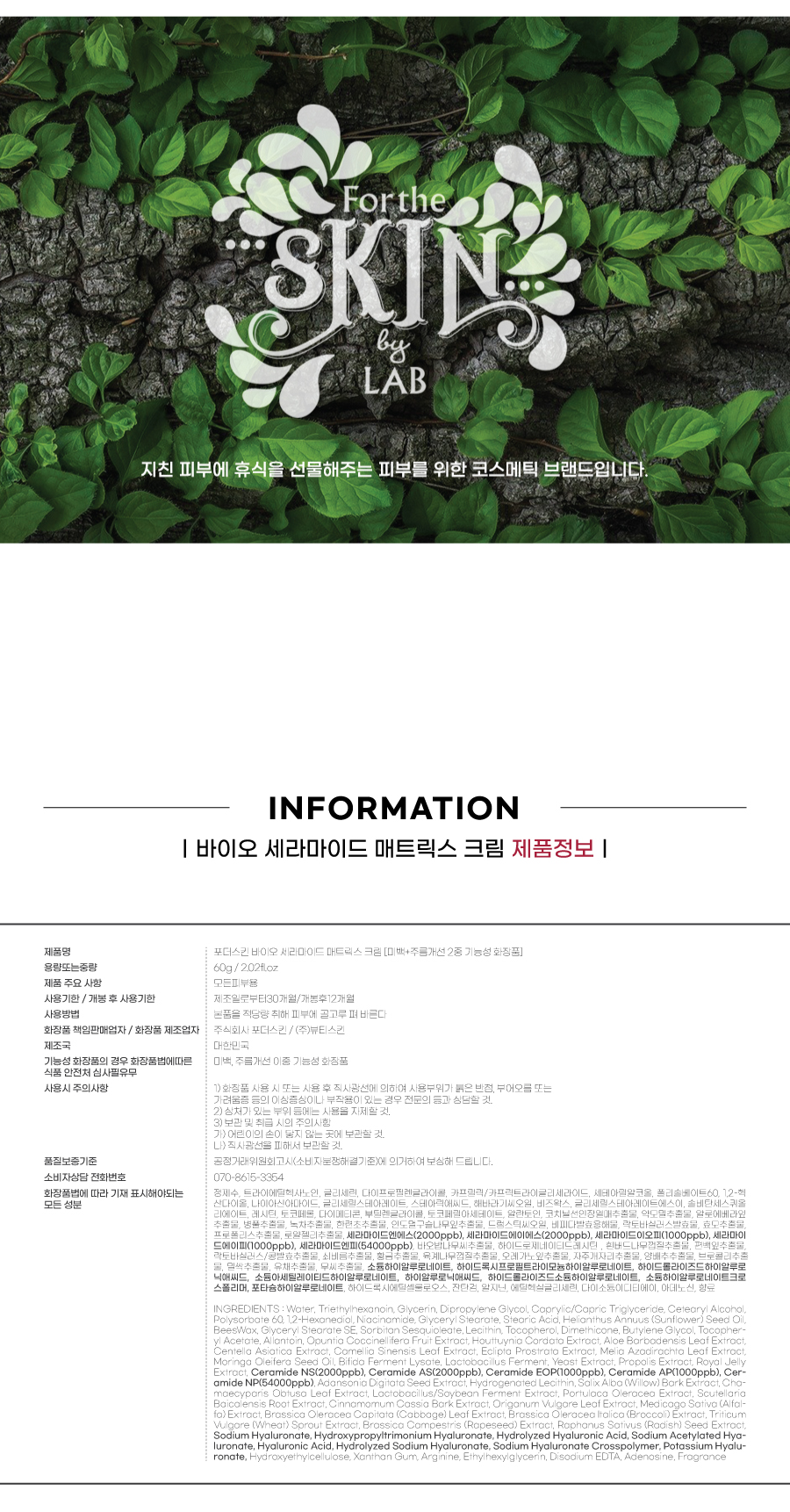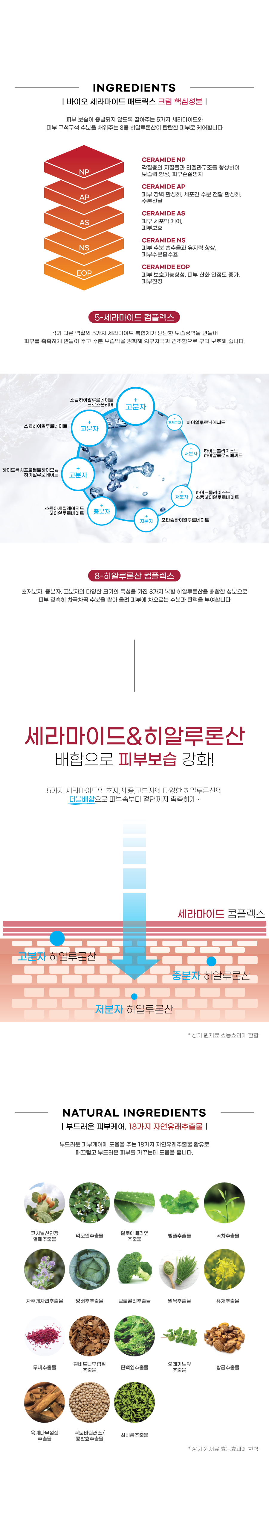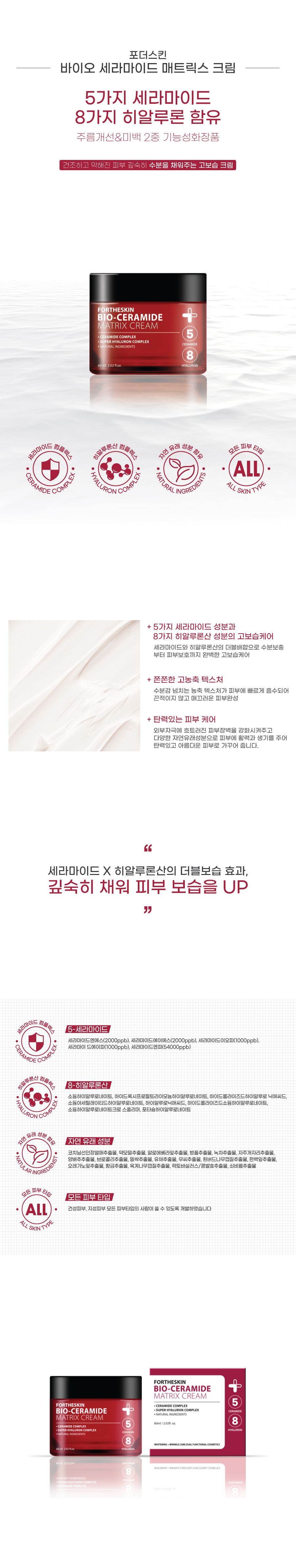 5-세라마이드 복합체와 8-히알루론산 성분은 외부 자극에 방해받는 피부 장벽을 강화시켜주며, 자연에서 발견된 26가지 유효 성분이 피부에 활력을 주고, 영양과 수분을 채워주어 건강하고 아름다운 피부로 가꾸어 줍니다.